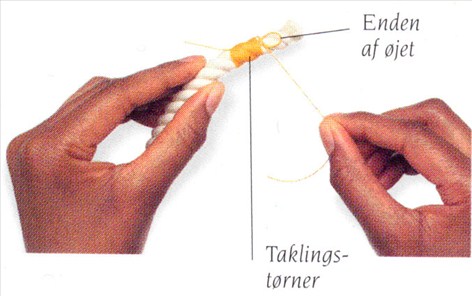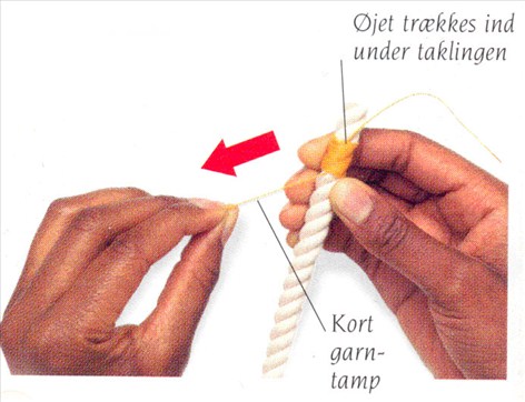 (4) For at trække øjet ind under tørnerne, trækker man hårdt i den korte garntamp ved starten af taklingen. Afkap eventuelt enderne.