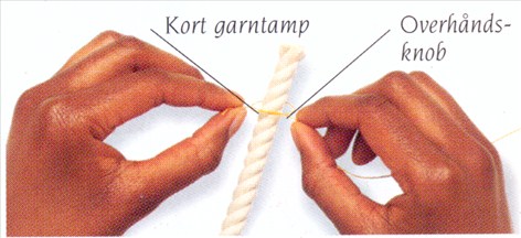 (1) Bind et overhåndsknob omkring et reb med takkelgarn, så en kort garntamp er fri.