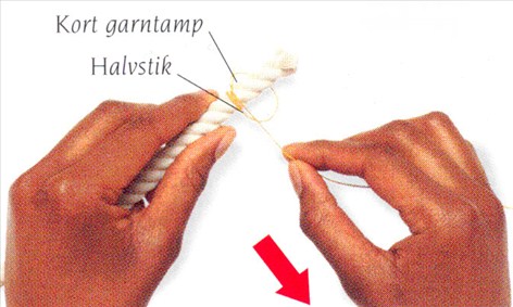 (2) Bind et halvstik ved at føre takkelgarnet under rebet og stikke det under sig selv oven på rebet. Stram garnet til, så halvstikket klemmer om den korte garntamp.
