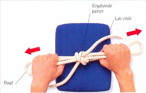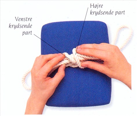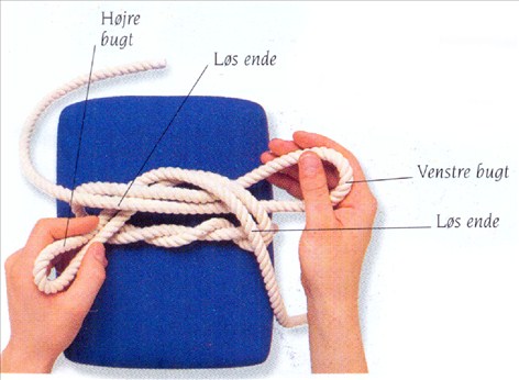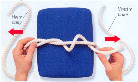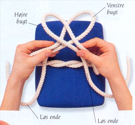 (1) Med en lang længde reb føres venstre tamp to tørn under højre tamp. Stram til i begge ender.