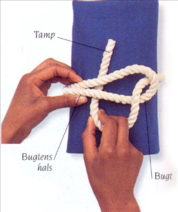 (1) Før en længde reb omkring den genstand, der skal bindes. Læg den ene rebende dobbelt, så der dannes en bugt. Før tampen op gennem bugten og derefter under bugtens hals.