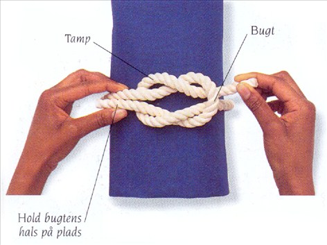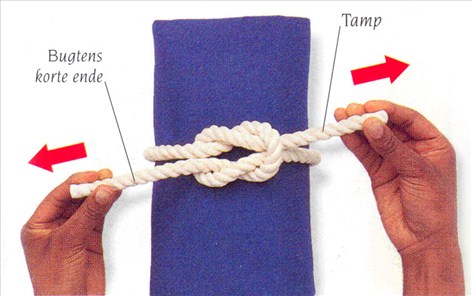 (3) Stram knobet ved at trække i tampen og bugtens korte ende. Bemærk, at tampene ligger i hver sin side af knobet.