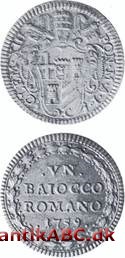 100 baiocchi = 1 scudo. Indtil midt i 1500-tallet var den af sølv, men herefter