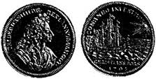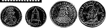 Fra venstre mod højre: Guineadukat 1682 med Planen af et af