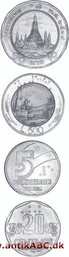 Blindskrift på 10 baht I989 fra Thailand, 500 lire 1982 fra