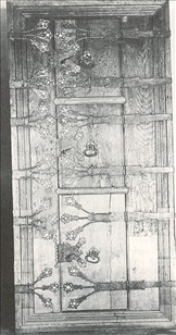 Gotisk skab med rigt udtungede jern beslag, gennembrudte og underlagt medfarvet læder eller papir (Kunstindustrimuseet).