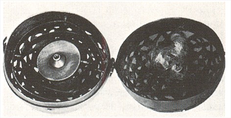 Håndvarmer åben. Man ser lampen i det kardanske ophæng.