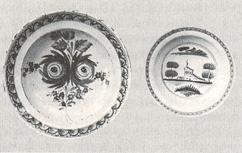 To Kellinghusen tallerkener med henholdsvis blomsterbemaling og arkitektur. Ca. 1800 (ABR).
