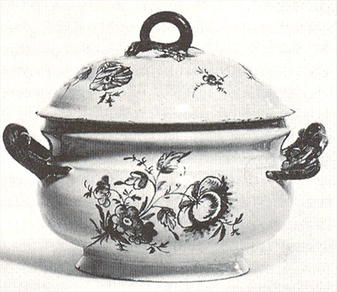 Terrin dekoreret med blå blomster, dr. Grauers fabrik, Kellinghusen ca. 1800 (ABR).
