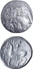 Zeushoved og på bagsiden en rytter. Denne type efterprægedes og spredtes mod
