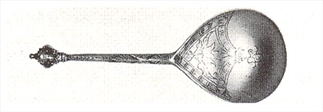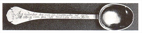 Ske af forgyldt sølv med rottehale og graveret inskription. Hofguldsmed Chr. Winnecke, København 1688