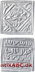 Firkantet tempelmønt hvis forbillede er en mohur fra mogulkejseren Akbar (1556-1605).