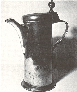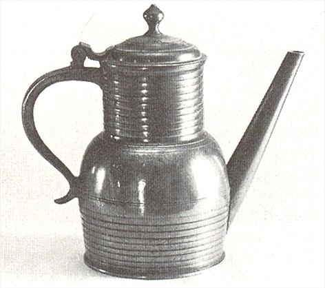Tudekande af tin med højt ansat tud. 1700-tallet (Privateje).