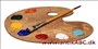 palet (latin lille spade) oval eller håndrigtig træplade, malere blander deres farver på;